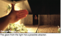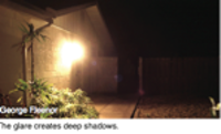 Glare gives would-be criminals a place to hide. Lower-wattage, downward-facing, shielded lighting more effectively illuminates a threat. In the first photo, left, the intruder is obscured by the glare of a floodlight. In the second, with glare blocked by a hand, the intruder can be seen. To be effective, floodlights must be shielded [photos and information about safety and lighting from IDA].
